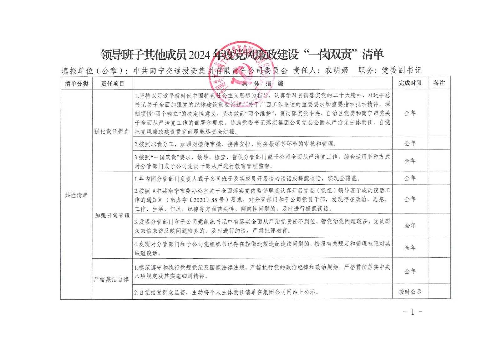 領(lǐng)導班子其他成員2024年度黨風廉政建設(shè)“一崗雙責”清單(一)