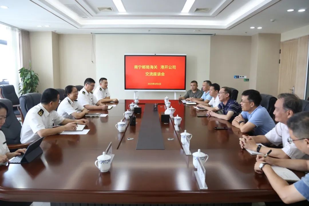 南寧郵局海關(guān)副關(guān)長李良、余泳,南寧交投集團(tuán)副總經(jīng)理、港開公司副董事長周宏,港開公司副總經(jīng)理藍(lán)澄、陳志杰及雙方有關(guān)部門負(fù)責(zé)人參加座談。(港開公司 覃燕春)