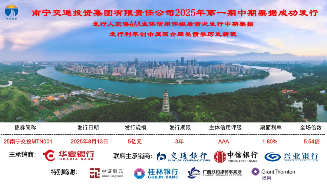 憑借良好的經(jīng)營業(yè)績、穩(wěn)健的財(cái)務(wù)表現(xiàn)和優(yōu)異的發(fā)展前景,8月13日,南寧交投集團(tuán)成功發(fā)行2025年度第一期中期票據(jù),發(fā)行金額5億元,期限3年。