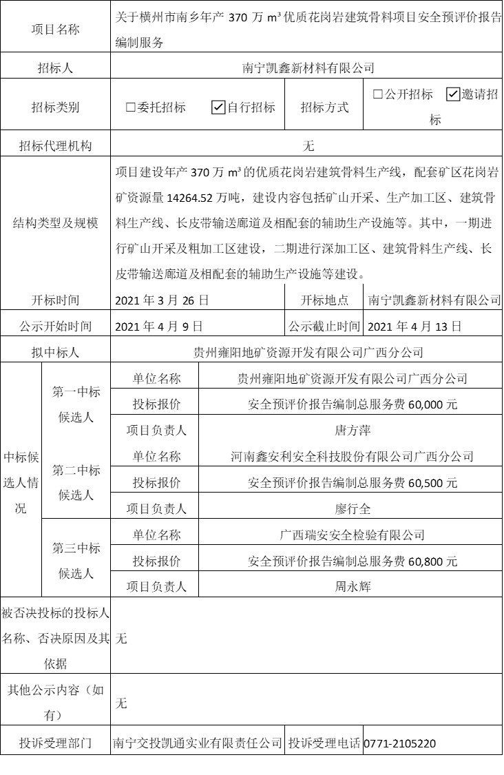 因公司發(fā)展需要,我集團(tuán)公司對(duì)金浦路24號(hào)城市花園白領(lǐng)公寓8套人才公寓及3個(gè)車位進(jìn)行出租底價(jià)評(píng)估,現(xiàn)將中標(biāo)結(jié)果公示如下:一、項(xiàng)目名稱:城市花園8套人才公寓及3個(gè)車位出租底價(jià)評(píng)估;二、開標(biāo)日期:2021年1月27日;三、中標(biāo)單位及中標(biāo)價(jià)格單位名稱:廣西誠信華正資產(chǎn)評(píng)估有限責(zé)任公司; 中標(biāo)價(jià)格(人民幣):肆仟陸佰伍拾元整(¥4650元);四、招標(biāo)人地址:南寧市青秀區(qū)站南東路2號(hào);聯(lián)系人姓名和電話:孫艷0771-2805236;五、公示時(shí)...